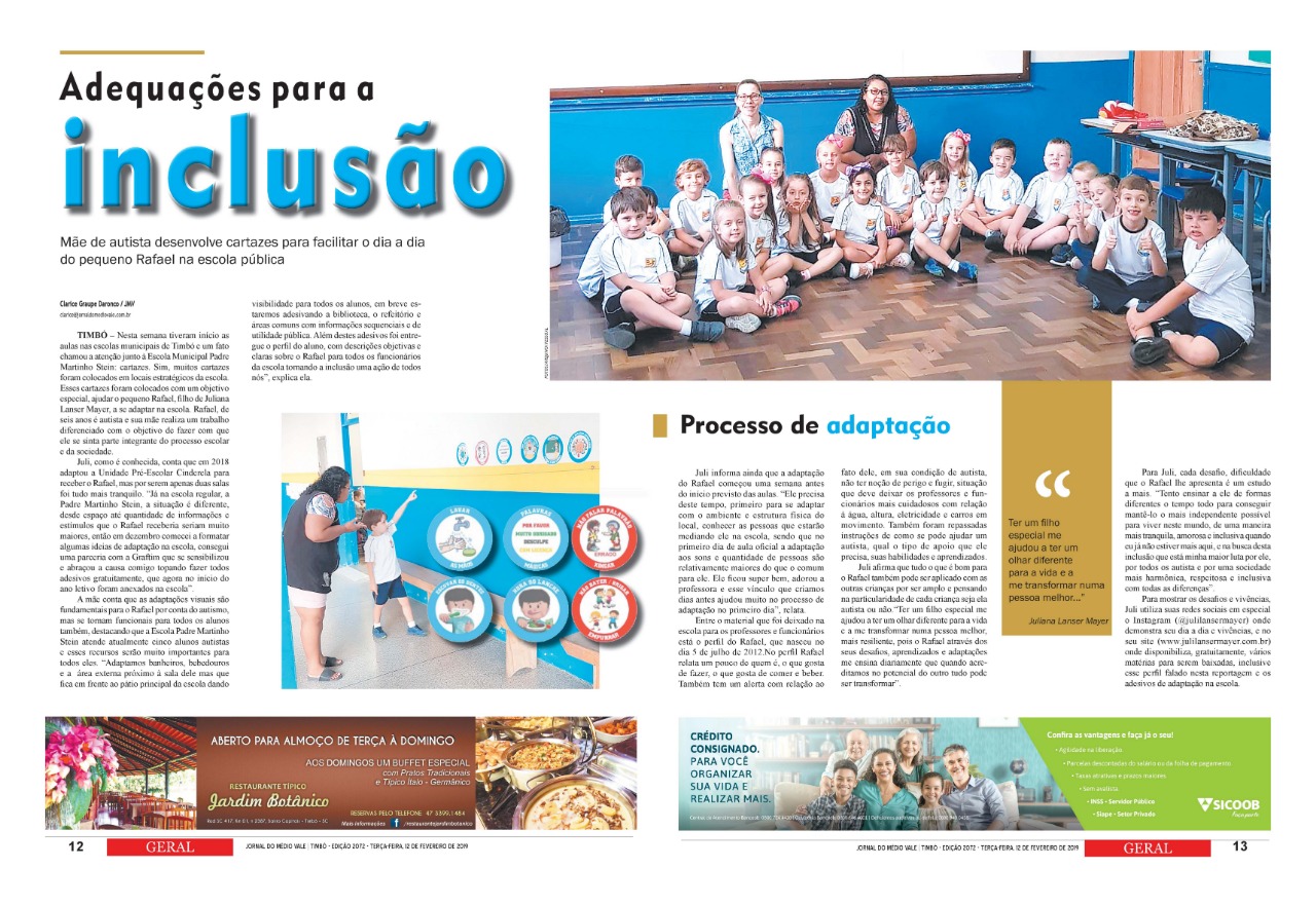 Juli, como é conhecida, conta que em 2018 adaptou a Unidade Pré-Escolar Cinderela para receber o Rafael, mas por serem apenas duas salas foi tudo mais tranquilo. “Já na escola regular, a Padre Martinho Stein, a situação é diferente, desde espaço até quantidade de informações e estímulos que o Rafael receberia seriam muito maiores, então em dezembro comecei a formatar algumas ideias de adaptação na escola, consegui uma parceria com a Graftim que se sensibilizou e abraçou a causa comigo topando fazer todos adesivos gratuitamente, que agora no início do ano letivo foram anexados na escola”.